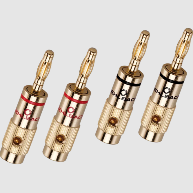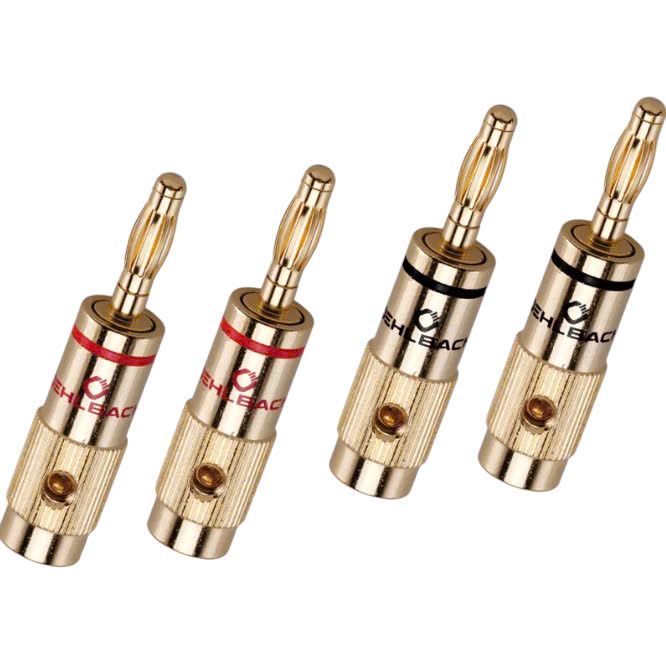 Banana connectors for assembling loudspeaker cables. The plugs enable optimum and convenient connection of speaker cables to speakers and electronic components, such as AV receivers and amplifiers. A secure contact and excellent transmission quality are ensured here. The plug contacts are plated with 24-carat gold and the cable feed may be executed at the plug up to cable cross-sections of 10 mm². We suggest that high-quality end sleeves be used on the leads for best assembly results.